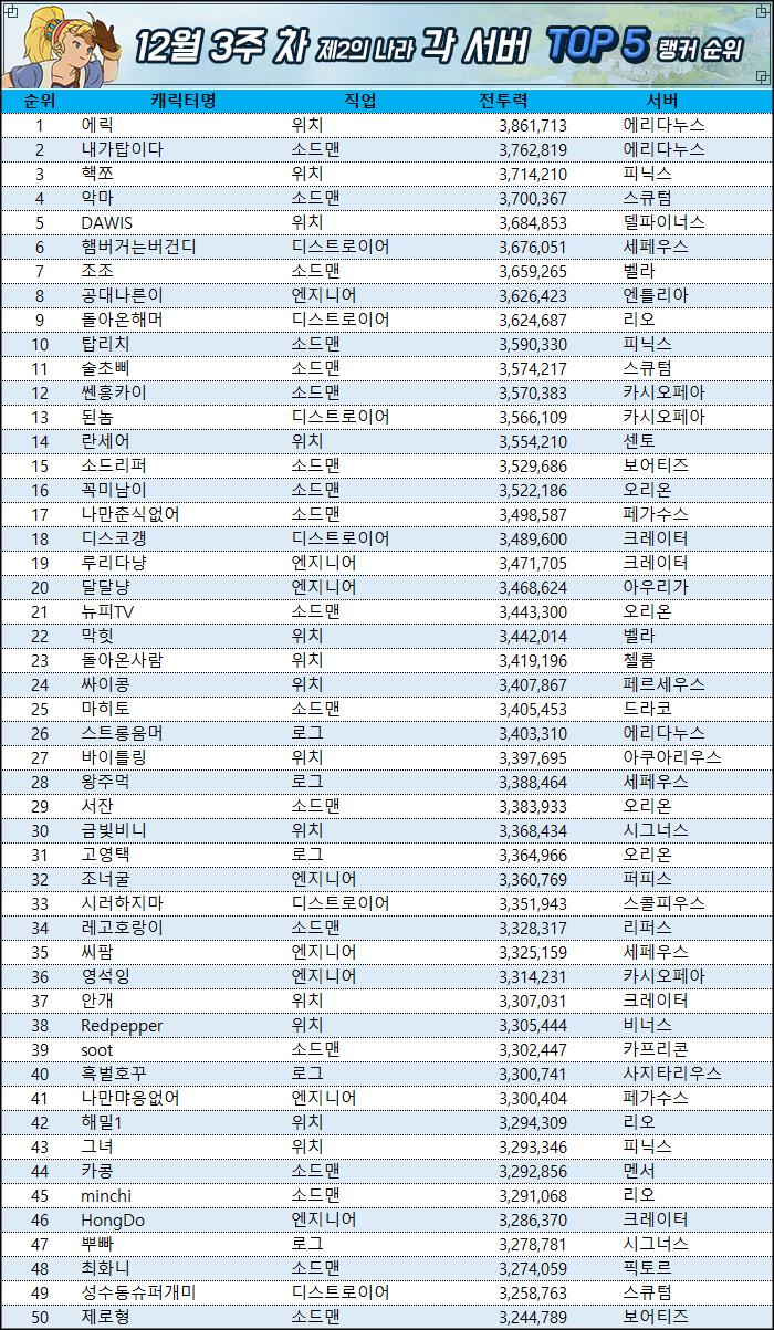 각 직업 최상위 랭커를 살펴보면 위치는 에리다누스 에릭이 1위, 소드맨은 에리다누스 내가탑이다가 2위, 디스트로이어는 세페우스 서버 '햄버거는버건디'가 6위, 엔지니어는 엔틀리아 서버 '공대나른이'가 8위, 로그는 에리다누스 서버 '스트롱움머'가 26위를 기록했다.