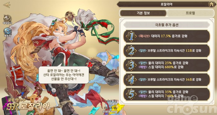 다만, 등급이 오르고 스킬이 달라졌다고 해서 꼭 장점만 있는 것은 아니다. 예를 들어 이번 치요의 경우 세리아드에게 일정 시간 동안 대미지 증가 효과를 부여하는데 대다수의 유저는 세리아드를 보조 형태로 사용했다. 그래서 장비 역시 보조 형태로 맞췄기 때문에 크리스마스 치요의 성능을 제대로 사용하긴 어려울 것이다.