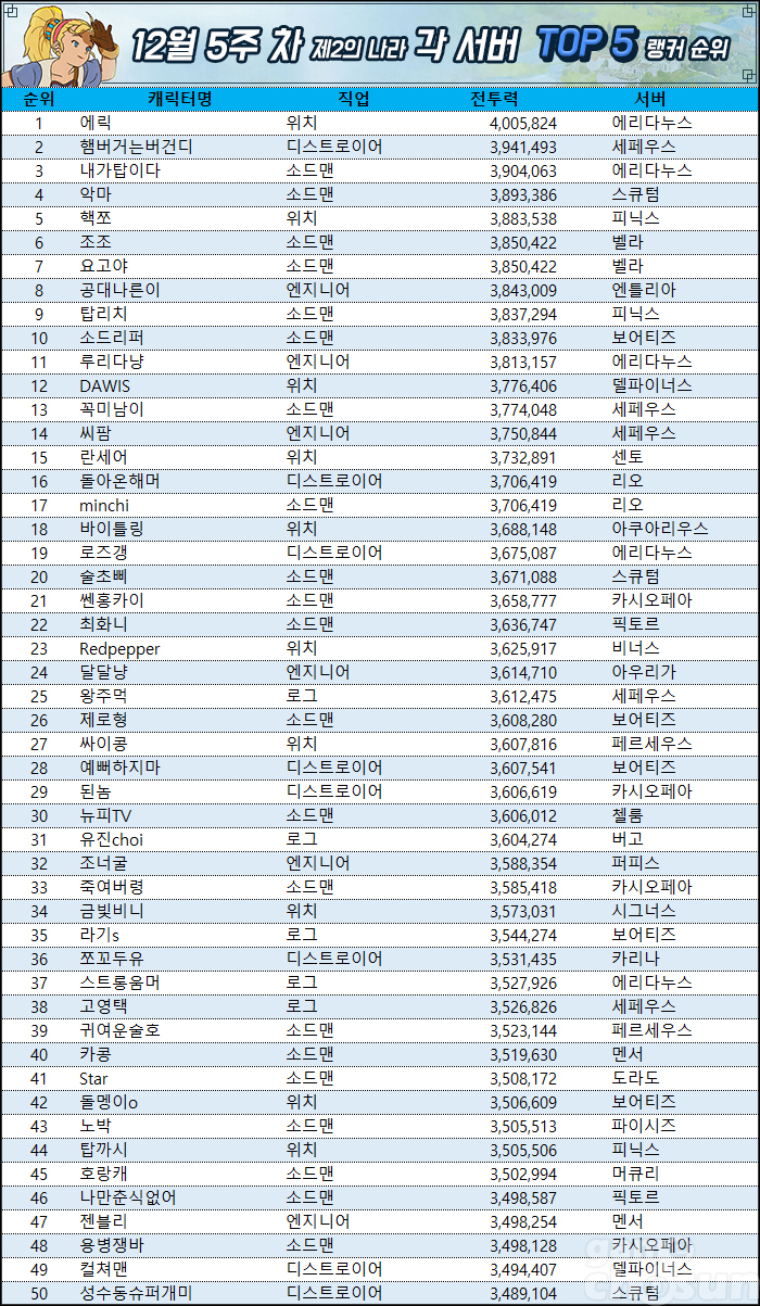 12월 5주 차 랭커 평균 전투력은 3,285,816을 기록했다. 지난 랭킹 대비 117,245 상승한 수준으로 서버 이전과 탈것 장식으로 인한 급상승을 보여줬다.