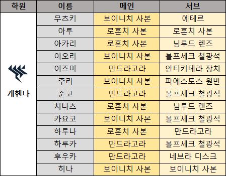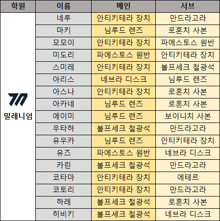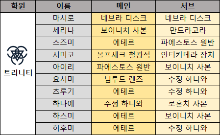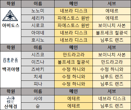 다음은 캐릭터별 메인 오파츠와 서브 오파츠를 정리한 표다. 일부 학생의 경우 메인과 서브가 모두 동일한 오파츠 종류를 사용한다.