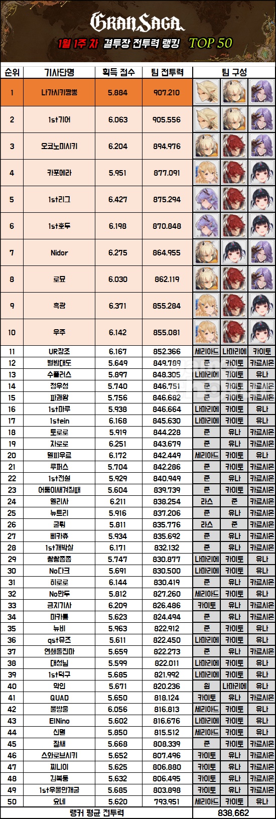 랭커 평균 전투력은 지난 랭킹 대비 17,599 상승한 838,662를 기록했다. 지난 랭킹 당시 일부 랭커의 전투력이 낮게 표기되면서 전투력 차이가 벌어진 것도 있지만, 키스톤 패키지 판매 재개로 많은 랭커가 파티를 강화하면서 전체적으로 전투력이 크게 상승한 것이 주요 요인이 되겠다.