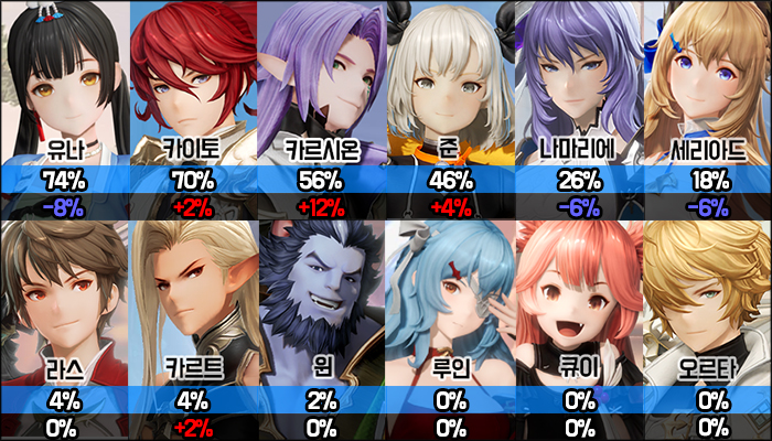 하위권 6인방의 선택률은 여전히 큰 변화가 없었다. 카르트의 선택률이 미세하게 올랐지만, 그래봐야 4%다. 큐이와 오르타는 신규 그랑웨폰을 받았지만, 두 그랑웨폰 모두 보스전용 그랑웨폰이다 보니 결투장 선택률에는 큰 영향을 주지 못한 것으로 보인다.