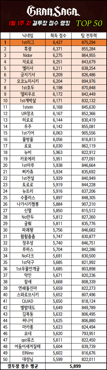 지난 랭킹 획득 점수 3위였던 '1st리그'가 2022년 첫 랭킹의 획득 점수 1위를 차지했다. 획득 점수는 145점 상승한 6,427점, 파티 구성은 나마리에, 카이토, 유나 조합에 전투력 875,294다. 2위는 1st리그에게 아쉽게 1위를 내준 '흑광'으로 획득 점수 6,37점, 전투력 855,284, 3위는 지난 랭킹 4위였던 'Nidor'로 획득 점수는 6,275점, 전투력은 864,955를 기록했다.