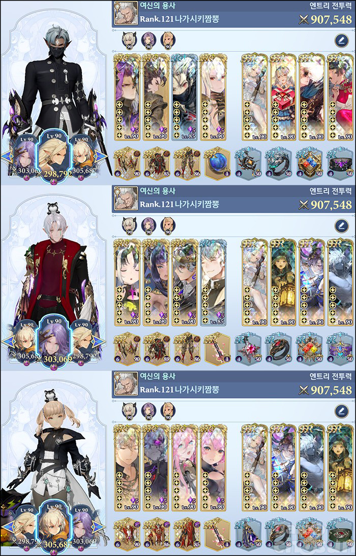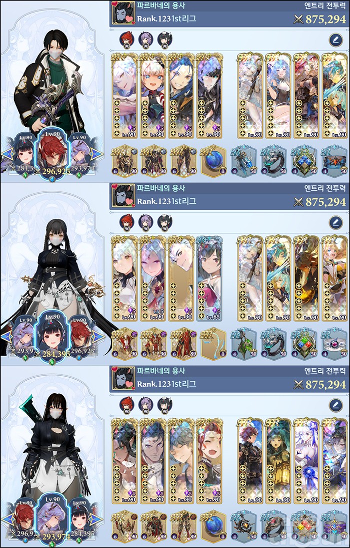 전투력 랭킹 1위는 어둠 파티를 사용하는 '나가사키짬뽕'이 차지했다. 총합 전투력은 907,210이며, 파티는 말 그래도 어둠속성 캐릭터 세 명을 다 기용한 형태다. 1위 자리를 오랫동안 지킨 어둠 파티, 이번 랭킹에선 혼자가 아니었다. 2위 '1st기어'도 어둠속성 캐릭터 세 명을 사용한 어둠 파티로 전투력 905,556을 기록하며 전투력 랭킹 2위에 올랐다.