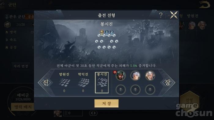 단순히 무장 간 조합에서 끝나는 것이 아니라, 각 부대의 진형과 장수 배치 등 세부적인 전술을 짤 수 있는 점도 매력적이다. 주요 진형으로는 방원진과 학익진, 봉 3명의 시진 등이 있다. 각 부대는 최대장수를 배치할 수 있으며, 1명의 주장과 2명의 부장으로 구성된다. 주장의 경우에는 각 장수가 가진 특수 스킬을 발동할 수 있기에 핵심적인 전술 요소로 활용된다.