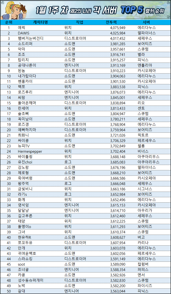 지난 랭킹에서 전투력 3,776,406으로 12위를 기록한 델파이너스 위치 'DAWIS'는 전투력 400만을 돌파하며 2위를 기록했다. 무려 10위나 상승한 것이다. 2위였던 세페우스 서버 디스트로이어 '햄버거는버건디'는 아쉽게 3위를 기록했지만, 바로 위 두 랭커와 마찬가지로 전투력 400만을 넘겼다. 전투력 400만을 넘길 것으로 예상했던 에리다누스 소드맨 '내가탑이다'는 지난 랭킹과 동일한 전투력으로 10위를 기록했다. 표기 오류로 인한 순위 하락의 가능성이 높게 점쳐진다.