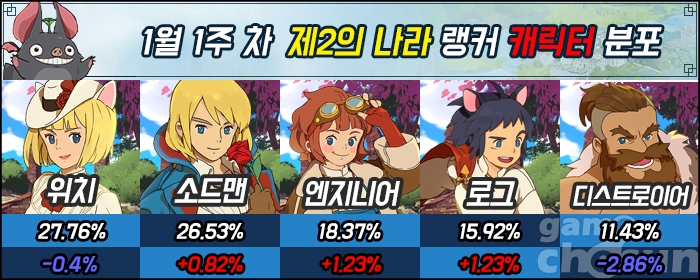 이번 랭킹에선 허리 라인 직업들의 점유율이 큰 폭으로 상승했다. 그중에서도 엔지니어와 로그는 나란이 1.23%가 상승하며 평균 이상의 점유율을 보여줬다.
