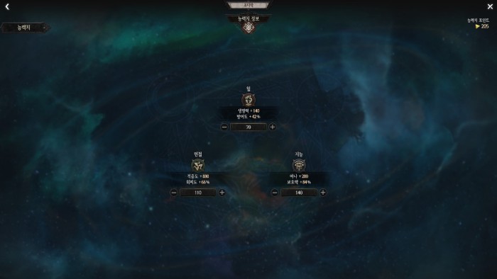 조디악 능력치, 힘, 능력, 민첩으로 구분되며 캐릭터 레벨업 시 5포인트가 주어진다 = 라인게임즈 제공