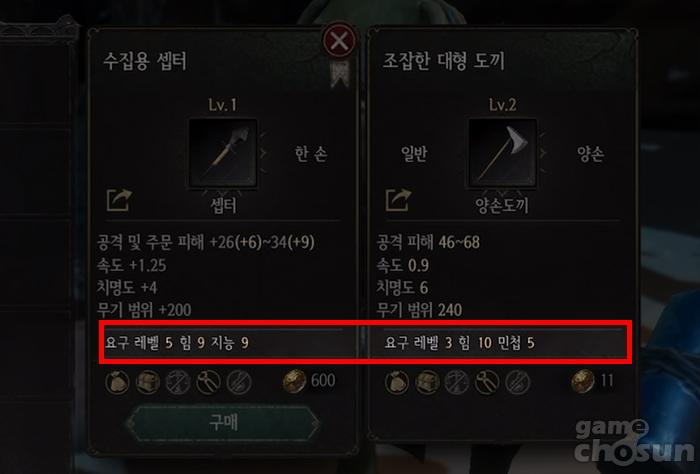 ▲ 장비와 스킬에는 요구 조건이 존재한다. 이에 따라 힘과 민첩, 지능을 잘 투자해야 한다.