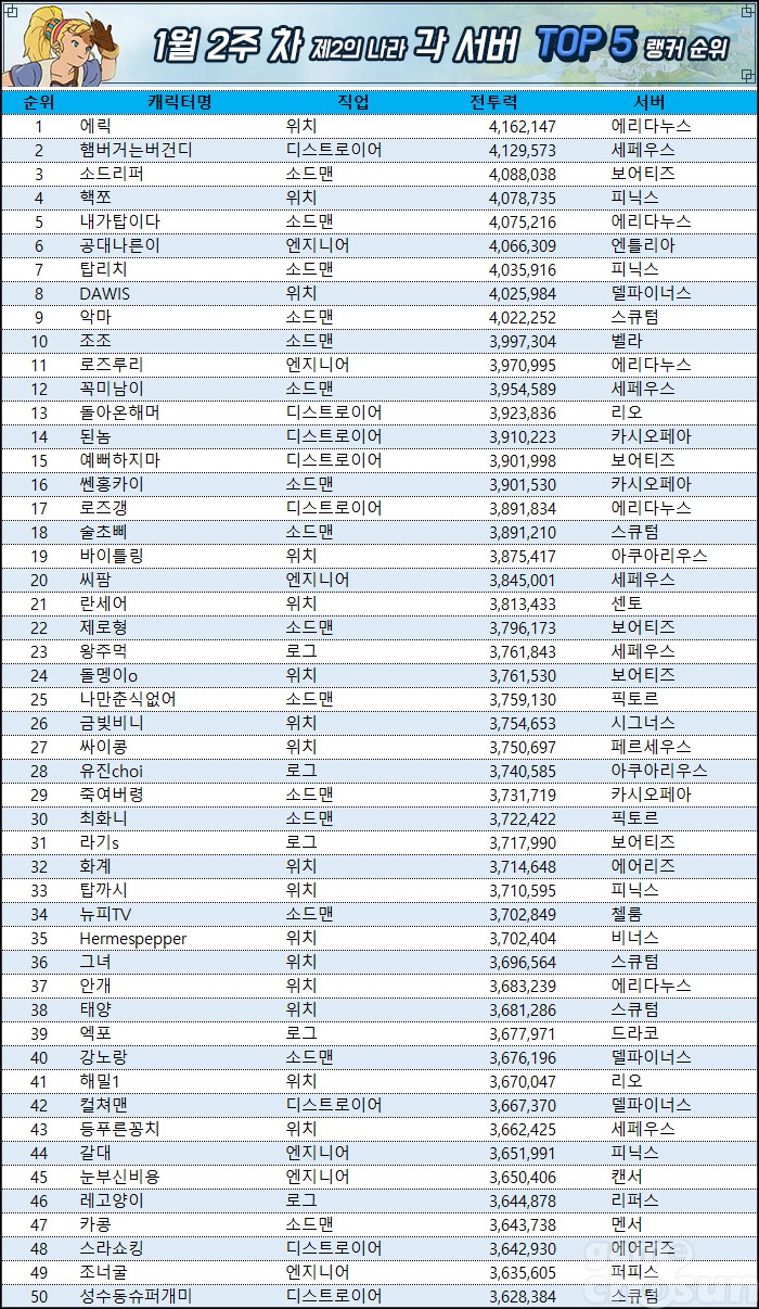 에리다누스 위치 에릭이 1위를 이어가고 있다. 전투력은 4,162,147. 지난 랭킹보다 86,198이나 상승했다. 2위를 기록한 세페우스 서버 디스트로이어 '햄버거는버건디'도 10만에 가까운 전투력 상승을 보여줬지만, 에릭을 따라잡기엔 부족했다. 3위는 지난 랭킹 4위였던 보어티즈 서버 소드맨 '소드리퍼'가 차지했다.
