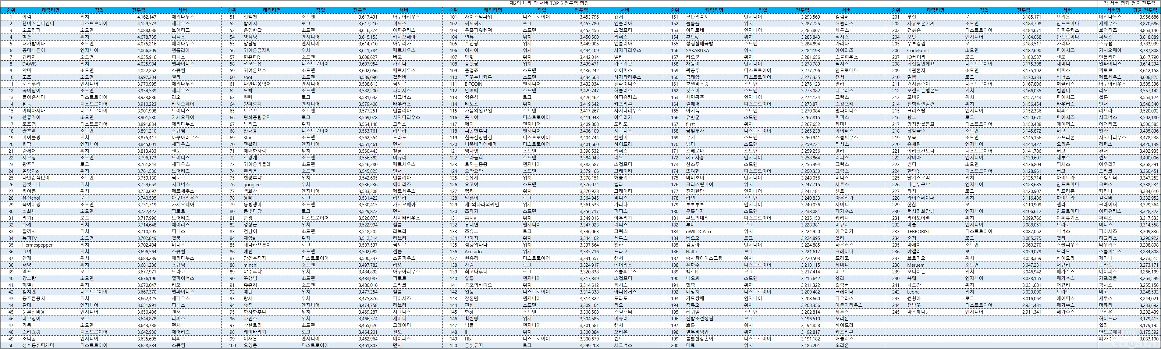 1월 2주 차 랭킹 랭커 245명의 평균 전투력은 3,433,747이다. 각 서버 랭커 평균 전투력을 나열하면 서버 이전 시작 후 강세를 보이기 시작한 에리다누스 서버, 세페우스 서버, 보어티즈 서버가 1~3위를 차지하고 있다. 특히 에리다누스 서버는 랭커 평균 전투력이 400만에 육박해 1위 배출 서버의 위엄을 과시했다.