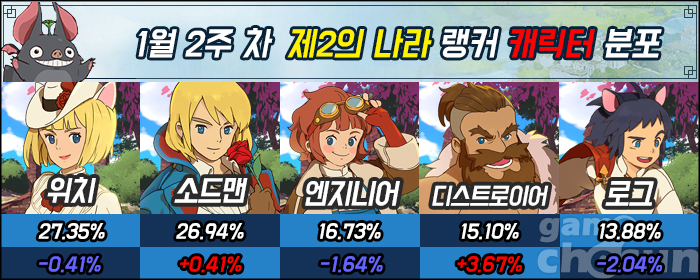 위치와 소드맨은 이번 랭킹에서도 큰 변화가 없었다. 여전히 26%가 넘는 점유율을 보여주며 1위와 2위를 차지하고 있다. 3위 엔지니어는 점유율이 1.64% 하락하긴 했지만, 15%를 넘기며 3위를 유지 중이다.