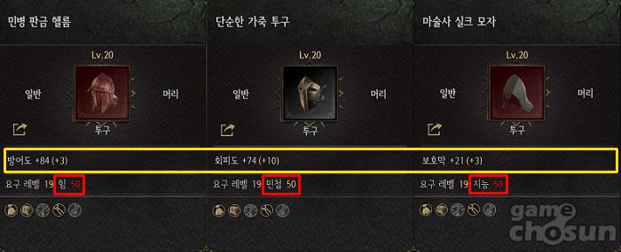 앞서 언급한 바와 같이 기본 스탯은 힘과 민첩, 지능으로 나뉜다. 이용자의 전투 스타일에 따라서 각 스탯을 분배하게 되는데, 이에 따라 장착하는 방어구의 종류도 달라진다. 방어구는 방어도를 높여주는 강철 및 판금형(이하 판금형)과 회피도를 상승시키는 가죽형, 그리고 보호막을 높이는 실크, 리넨, 벨벳형(이하 실크형)으로 나뉜다.