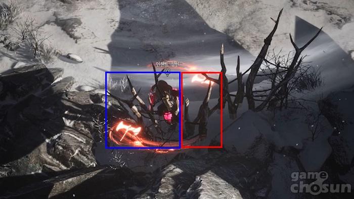 같은 6시 공간이더라도 좌측은 회피가 가능한 반면 우측은 피해가 들어온다. = 게임조선 촬영