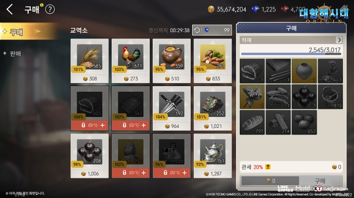 ‘대항해시대 오리진’에서는 각 지역을 항해하며 교역이 가능하다. 교역에 필요한 교역품은 항구의 교역소에서 구매하거나 전투를 통해 획득할 수 있으며 식료품, 가축, 공예품을 비롯해 명산품 등 다양한 품목이 존재한다.