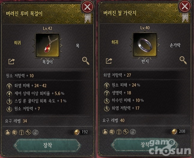 이 중 가장 추천하는 장비는 '루비 목걸이'다. 기본 옵션에 원소 저항력을 가지고 있어 추가 옵션까지 원소 저항력을 맞추면 손쉽게 네 가지 원소 저항력을 적당한 수치로 맞출 수 있다. 여기에 공략할 콘텐츠에 맞는 원소 저항력을 기본 옵션으로 가지고 있는 반지까지 구비하면 60% 경감 수준까진 손쉽게 달성할 수 있다.
