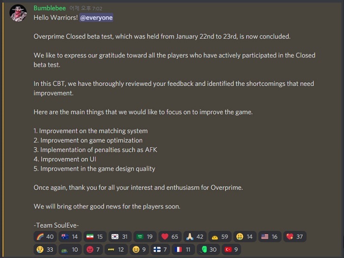 한편, 팀 소울이브는 테스트 종료 후 유저 피드백을 검토한 결과, 매칭 시스템과 게임 최적화, UI, 게임 디자인 퀄리티 등을 개선하고, 탈주 페널티를 구현할 것이라고 밝혔다.