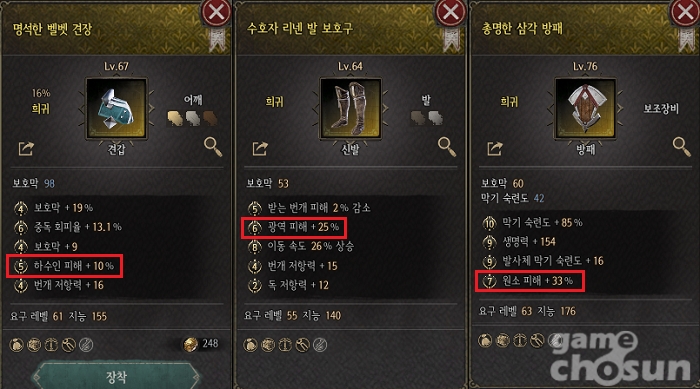 견갑, 신발, 방패에 있는 포기하긴 아쉬운 대미지 옵션 = 게임조선 촬영