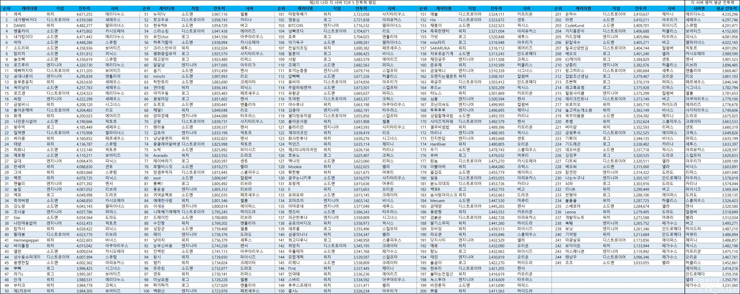 ■ 랭커 전원 전투력 300만 돌파, 평균 1위 서버는 에리다누스