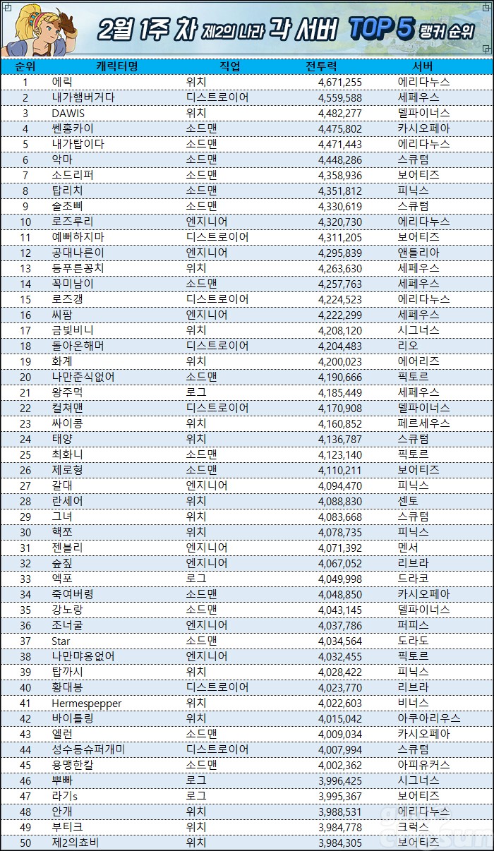 에리다누스 위치 에릭이 전투력 4,671,255로 전 서버 전투력 1위를 지켜냈다. 전투력 상승량은 무려 302,914. 지난 랭킹 상승량의 약 3.7배 수준이다. 에릭 외에도 많은 랭커가 신규 지역 및 메인 퀘스트, 장비 각인, 필드 보스, 스킬 추가로 전투력을 크게 상승시켰다.