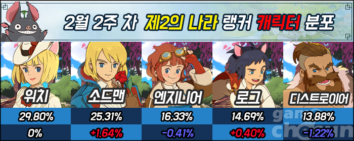 지난 랭킹에서 29.8%로 30%에 근접했던 위치는 그 성적을 그대로 유지하며 1위를 기록 중이다. 위치의 뒤를 이어 소드맨 랭커들이 대거 랭킹에 진입하며 점유율 25%를 넘겼다. 엔지니어는 소폭 하락하긴 했지만 여전히 3위를 유지 중, 로그와 디스트로이어 랭커들의 성장률이 높지 않아 다음 랭킹에서도 3위를 유지할 것으로 보인다.
