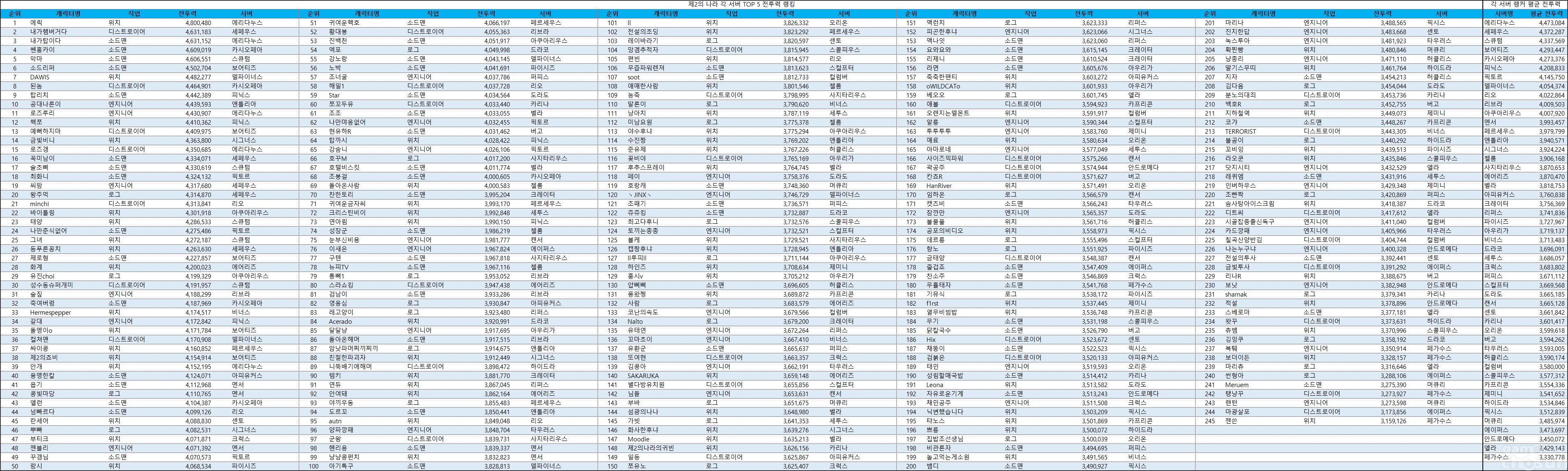 평균 전투력이 가장 높은 서버는 지난 랭킹과 마찬가지로 에리다누스였다. 4위 보어티즈 서버까진 지난 랭킹과 순위가 동일하나 5위의 경우 순위 네 개를 뛰어넘은 카시오페아 서버가 차지했다.