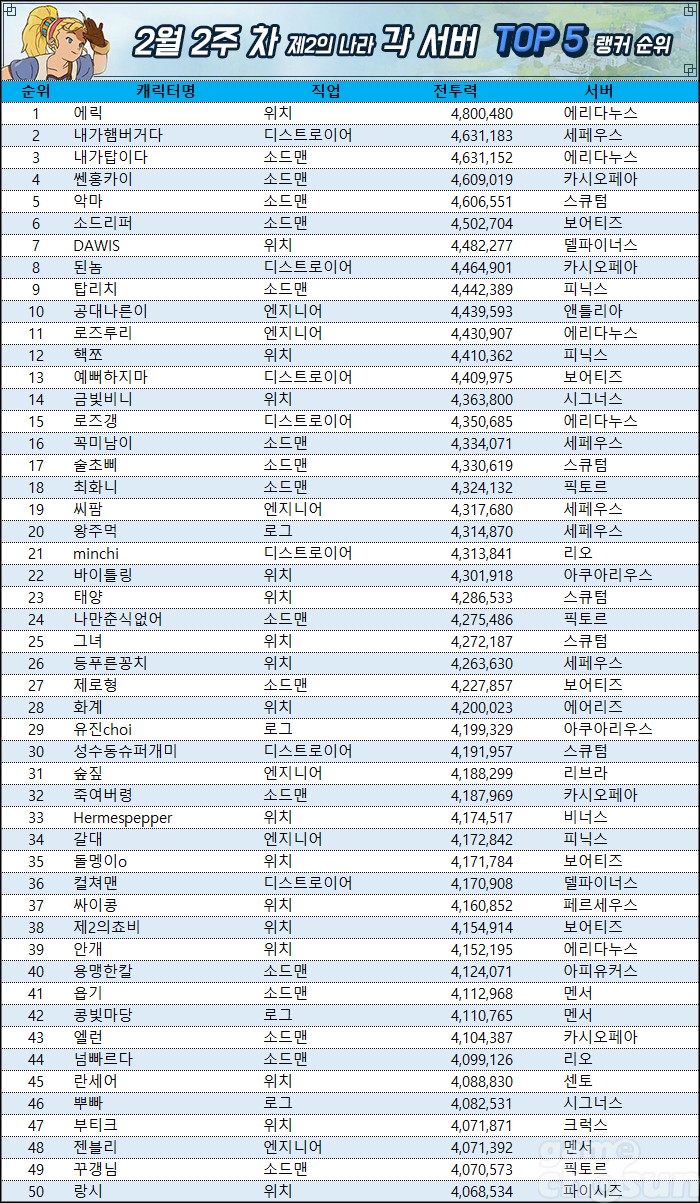 신규 스토리 및 장비 각인 업데이트가 추가된 지 2주가 지나고 있다. 랭커들의 성장은 계속되고 있으며, 1위 에릭은 무려 전투력 480만에 도달했다. 성장 속도를 감안하면 2월 내로 전투력 500만 랭커들이 등장할 것으로 보인다.