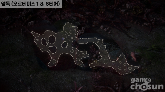 맹독은 넓은 지역 안에 오밀조밀 군집이 형성되어 있어 직관적인 동선은 없어도 끊임없이 다수의 적을 상대할 수 있는 던전이다. 오브젝트 수도 바위보단 적지만 충분히 많은 양이 배치되어 있어 부수입도 짭짤하다.