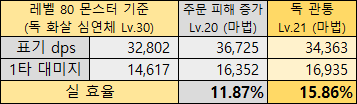 21레벨 매직 등급 독 관통 룬으로 80레벨 몬스터를 때려가며 비교할 때 실제 딜 상승율은 15.8% 정도가 상승한다. 앞서 물리 관통 룬에 비하면 꽤 낮은 수치다.