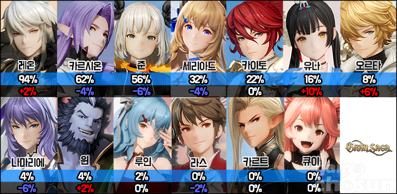 하위권 캐릭터는 여전히 거의 선택되지 않는 수준이다. 오르타가 하위권 탈출의 기색을 보이는 대신 나마리에가 그 자리를 채워 윈과 나란히 4%를 기록했다.