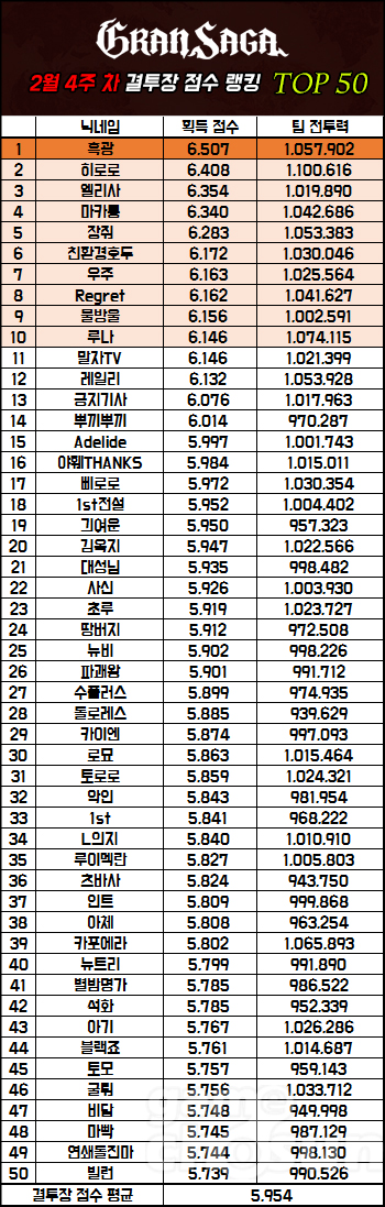 엔픽셀이 서비스 중인 모바일 MMORPG '그랑사가'의 결투장 55주 차 점수 1위는 '흑광', 전투력 1위는 '히로로'가 차지했다.