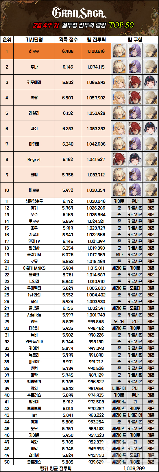 랭커들의 평균 전투력은 30,048 상승안 1,006,269를 기록했다. 가디언 업데이트 이후 랭커들의 전투력 상승량이 전체적으로 둔화되면서 결투장 전투력은 전반적으로 100만 전후에서 멈춘 모양새다.