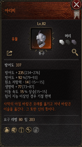 아라피는 힘이 지능보다 높은 경우 기절 상태이상 면역이라는 독특한 효과를 가지고 있다. 해당 효과를 제외하고 봐도 투구에 이동 속도 상승이 붙어있으며 매우 높은 수치의 방어도를 가지고 있다. 다만 원소 저항력이 꽤 거슬릴정도로 감소해 이 부분은 다른 곳에서 보완해줘야 한다.