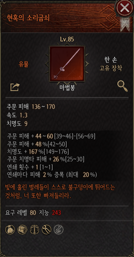 현혹의 소리굽쇠는 연쇄 피해를 입히는 주문에 최적화된 마법봉이다. 연쇄 횟수를 1회 늘리며 연쇄마다 피해가 최대 20%까지 증폭된다. 연쇄 관련 옵션을 제외하고 봐도 주문 피해가 플랫과 % 둘 다 높은 수치를 제공해 주며 치명도와 치명타 피해도 10티어에서나 찾아볼 수 있는 높은 수치의 옵션이 붙어 있다.