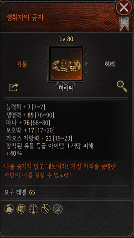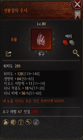 또한 카오스 저항력까지 23이라는 높은 수치를 제공해 주고 능력치, 생명력, 보호막 등 기초 스탯을 준수하게 붙어있어 유틸 옵션도 어느 정도 챙겨갈 수 있다.