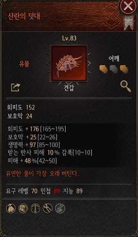 산란의 덧대는 소환수 빌드만 아니면 묻지도 따지지도 않고 피해 50%를 올려주는 옵션이 주목받는다. 일반적인 피해 증가 옵션이 10티어는 가야 나오는 수치를 유물로 해결할 수 있다. 회피도와 보호막, 생명력을 고르게 챙겨줘 생존력도 꽤 보장받는다.