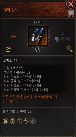 철의 엄지는 장착 레벨이 8밖에 안되지만 쇠뇌 화력 관련 옵션을 세 종류나 가지고 있는 장갑이다. 기존 장갑 인챈트 옵션에선 찾을 수 없는 쇠뇌 화력 증강 옵션이 붙어 있어 쇠뇌 빌드라면 우선적으로 채용할만하다. 다만, 레벨 제한이 낮은 방어구인 탓에 약간의 생명력과 민첩을 제외하면 오로지 쇠뇌 화력 옵션만 있는 점에 주의해야 한다.