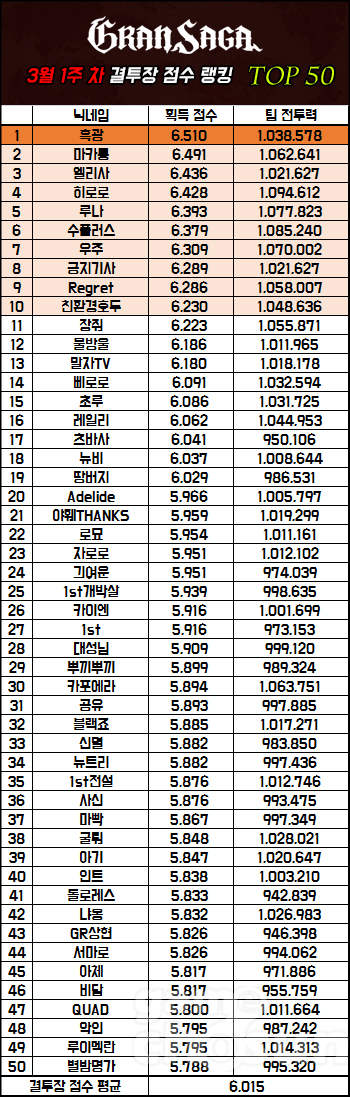 흑광이 3주 연속 점수 랭킹 1위를 가져갔다. 특이한 점은 기존 사용하던 파티에서 카이토 대신 유나를 사용하고 있다는 것이다. 덕분에 전투력은 소폭 하락했지만, 획득 점수는 6,510점으로 지난 랭킹 대비 3점 올랐다. 유나의 그랑웨폰 세팅은 많은 유저가 애용하는 홍길동, 연놀부, 가언대사, 천하를 사용하고 있다.