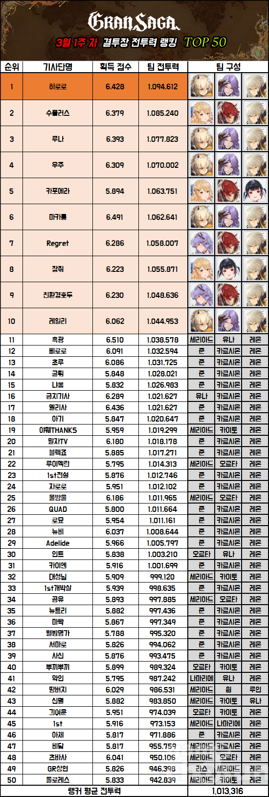 이번 주 랭킹에서도 히로로가 전투력 1위를 달성하며 3주 연속 기록을 이어가고 있다. 전투력은 지난 랭킹 대비 소폭 하락한 1,094,612, 파티는 여전히 준, 카르시온, 레온을 사용 중이다. 2위 '수플러스'가 기존 파티 중 유나를 세리아드로 교체하며 전투력 100만에 진입했지만, 아쉽게 히로로 추월엔 실패했다.