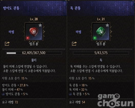 관통력 효율은 초창기부터 밝혀지기보다는 카오스 던전까지 진입해 높은 레벨의 몬스터를 상대하기 시작한 뒤 연구되온 주제다. 기존까진 몬스터의 원소 저항력이 없다시피 해 물리 공격을 강화시켜주는 방어도 관통과 달리 원소 관통은 효율이 비교적 적다고 알려졌었다.