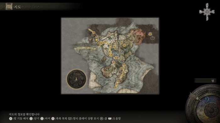 지역이 더 넓어진만큼 엘든 링은 무려 지도를 제공한다. 불편함을 최고의 미덕으로 치는 게임에서 지도라는 것을 제공한다는 것은 놀랄만하지만 반대로 말하면 '이마저도 없다면 여기가 어딘지 감도 잡지 못할 것'이라는 의미이기도 하다. 지도는 구역별로 해당 지도 조각을 얻어야 활성화되며 세이브와 정비가 가능한 축복의 위치를 포함한 주요 지역을 표시해줘 적어도 길을 잃게 만들진 않는 역할을 한다.