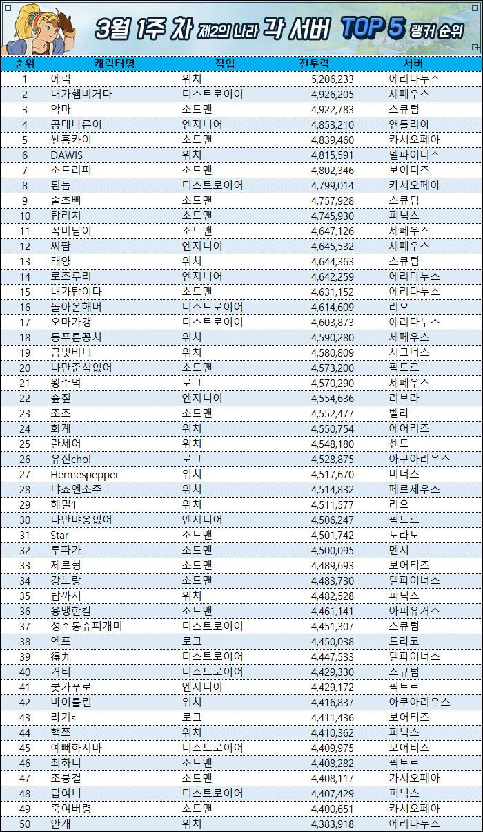 에리다누스 위치 에릭이 전투력 520만으로 부동의 1위를 유지하고 있다. 이번에도 전투력을 10만 가량 상승시키며 다른 랭커들을 여유롭게 떨쳐냈다. 이와 함께 세페우스 서버 디스트로이어 '내가햄버거다'와 스큐텀 서버 소드맨 '악마'가 각각 전투력 490만을 돌파하며 두 번째 전투력 500만 돌파를 위해 맹렬히 질주 중이다.