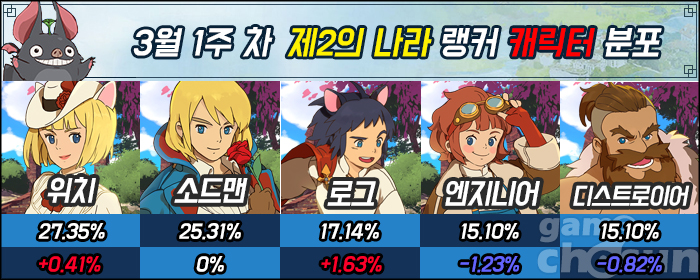 상위권은 여전히 위치와 소드맨이 굳건히 지키고 있다. 위치의 경우 점유율이 소폭 상승했으며, 소드맨은 지난 랭킹과 마찬가지로 25.31%를 안정적으로 유지하며 2위를 기록 중이다.