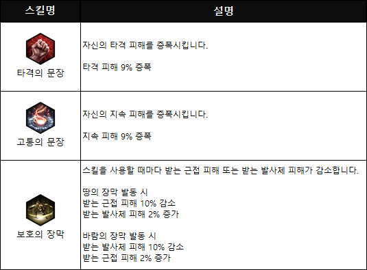 '타격의 문장'은 간단한 게 최고라는 표현을 그대로 보여주는 스킬로 오라 활성화 시 자신의 타격 피해를 증폭시키는 효과를 가지고 있다. 증폭 수치도 룬 성장을 통해 올릴 수 있어 희귀 등급 합성 전용 스킬 중 1등이라 해도 과언이 아니다.