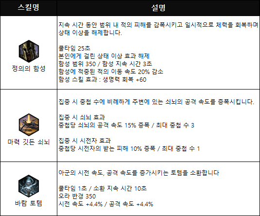 '정의의 함성'은 자신에게 걸린 해로운 상태 이상을 풀고 생명력까지 회복할 수 있는 매우 좋은 스킬이다. 단독으로 사용해도 충분히 좋으며 '제어 상태 이상 발생 시 버프 발동' 링크 룬과 조합하면 적에게 맞았는데 갑자기 생명력이 차오를 정도로 생존력이 크게 좋아진다.