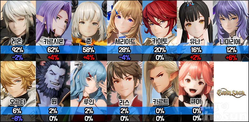 레온의 선택률이 약간 하락하긴 했지만, 여전히 90%를 넘기고 있다. 단짝인 카르시온과 준은 이번 랭킹에서 4%씩 상승해 60% 언저리를 멤돌고 있다. 세리아드의 선택률이 줄긴 했지만, 카르시온과 준을 사용하지 않는 랭커들에게 여전히 사랑 받고 있어 꾸준히 30% 전후 선택률을 보여주고 있다.