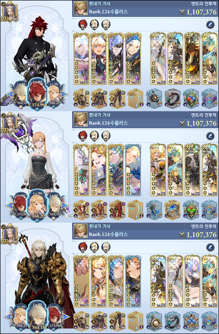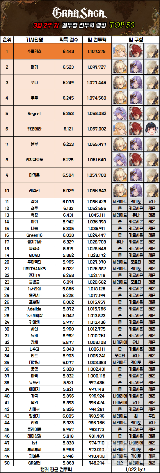 전투력 랭킹 1위는 '수플러스'가 차지했다. 달성 전투력은 1,107,375로 2위 패기와 차이가 불과 9,648이다. 사용 파티는 세리아드, 카이토, 레온으로 2어둠+레온 파티와 더불어 많은 랭커가 사용하고 있는 조합을 쓰고 있다.