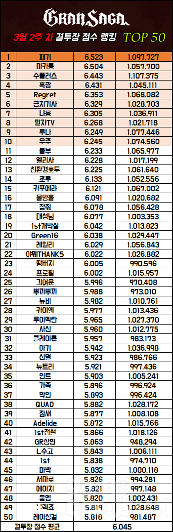 3주 연속 전투력 랭킹 1위를 기록했던 패기가 이번엔 점수 랭킹 1위를 달성하며 양대 랭킹 1위 기록을 하나씩 가져갔다. 아쉽게도 전투력 랭킹 1위는 수플러스에게 근소한 차이로 넘겨줬지만, 각 랭킹 1위를 한번씩 차지한 유저가 드물기 때문에 충분히 의미있는 기록이라 하겠다.
