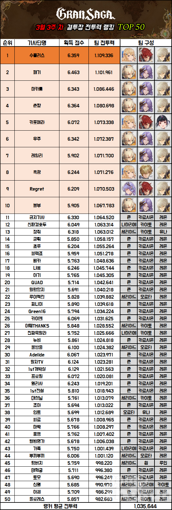 전투력 랭킹 1위는 앞서 언급한 대로 수플러스가 차지했다. 패기와 마찬가지로 2주 연속 1위 기록을 세웠다. 달성 전투력은 1,961 상승한 1,109,336이며, 2위 패기와 불과 7,375 차이다. 파티는 지난 랭킹과 마찬가지로 세리아드, 카이토, 레온을 사용 중이다.