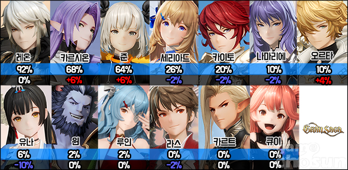 이번 랭킹은 마치 지난 랭킹을 그대로 옮겨 놓은 듯 비슷한 양상을 보여줬다. 10일 업데이트는 신규 콘텐츠 추가보단 편의성 개선과 전투 밸런스 조절 등 기존 콘텐츠 보완에 가까웠던 만큼 결투장에 큰 영향을 주진 못했다. 다만, 캐릭터 선택률 부분에선 오르타가 다시 두 자리수 선택률을 기록하고, 유나가 하위권으로 떨어지는 등 치열한 접전을 보여줬다.